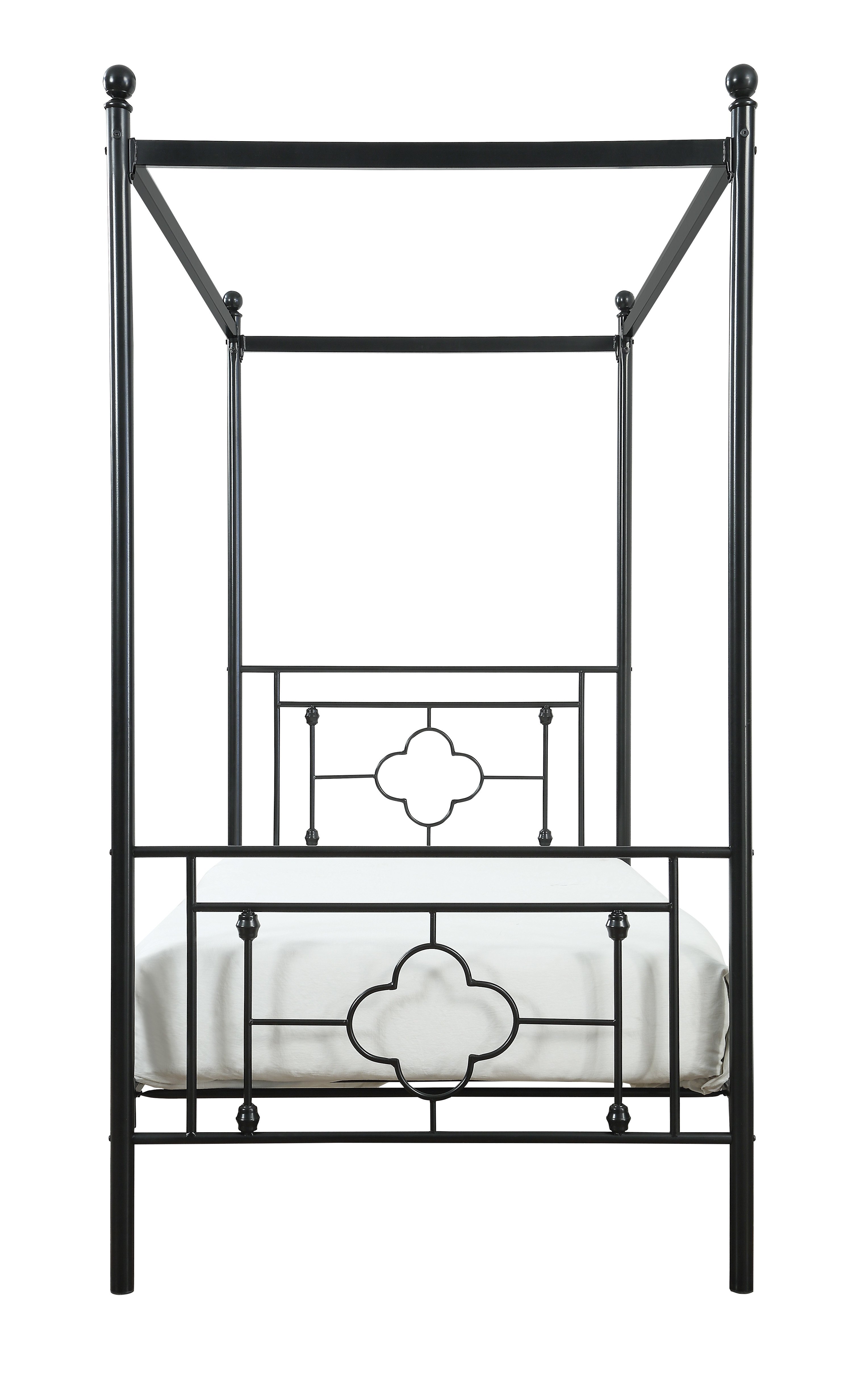 Inspired by vintage design, ball finials top the canopy frame while prominent decorative jointing and classic quatrefoil pattern lend to the modern traditional look of the Hosta Collection. The built-in platform support allows for the use of a mattress without a box spring. The Hosta collection is offered in twin and queen size bed options for versatile placement within your home.PRODUCT DIMENSIONS: Overall Dimension: 40.5" x 78" x 77"HHeadboard width: 40.5"Headboard height: 39.75"Footboard width: 40.5"Footboard height: 28.25"Rail to floor: 9.25"Listing Includes: One Twin Size Platform Bed Only.Mattress: Not included.Simple Assembly Require.