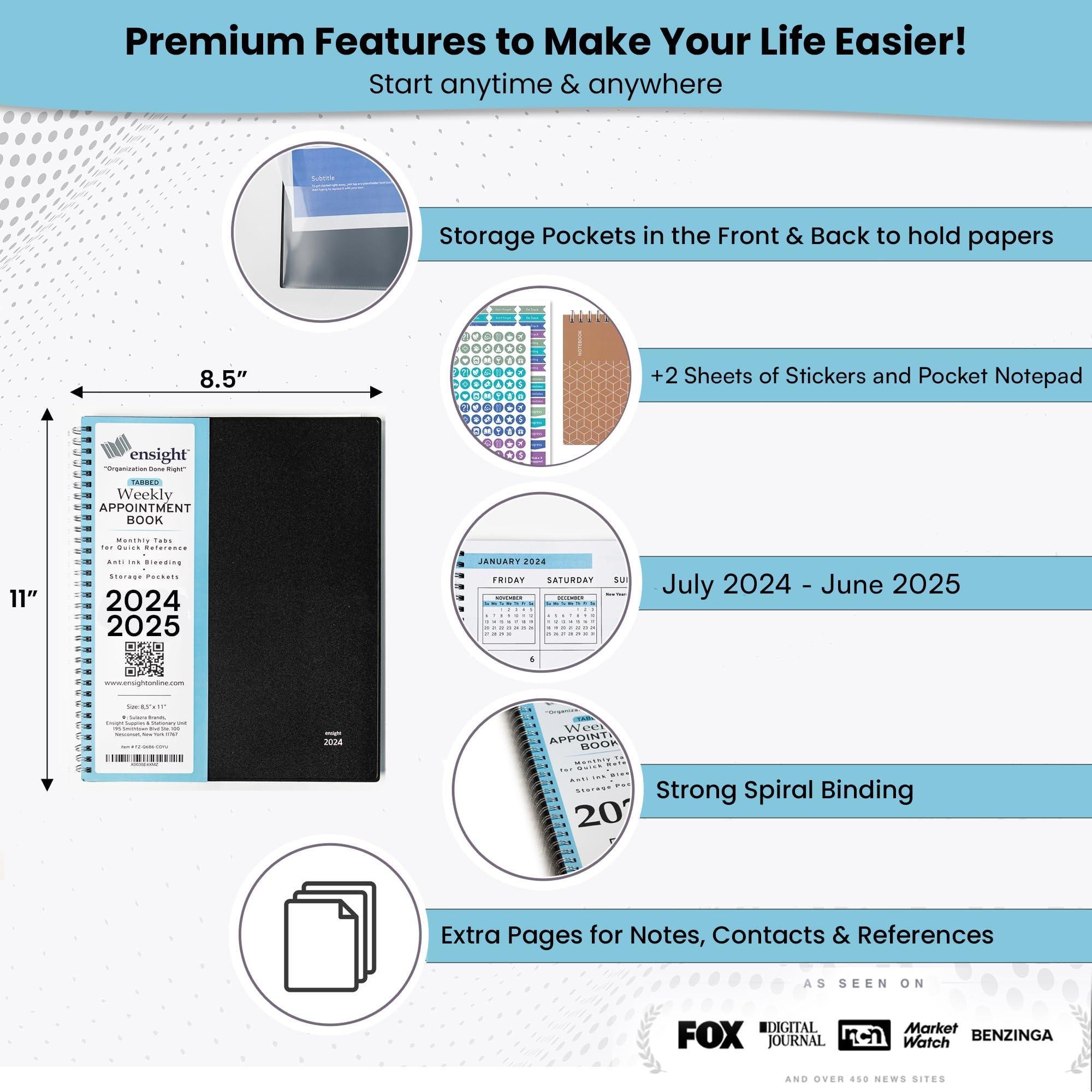 1.July 2024 - June 2025 Appointment Planner: Use Ensight Appointment Book Planner to its greatest potential by utilizing monthly tabs, Pocket folders for safekeeping of important papers. All the pages have durable ink bleed resistance. Starts the Week Monday and Ends Sunday: Manufactured with top-quality strong black PVC cover with extra strong twin-wire binding to prevent any tearing. 15-Minute Daily Appointment Book: Ensight Salon Appointment Book Planner Covers 12 months from July