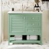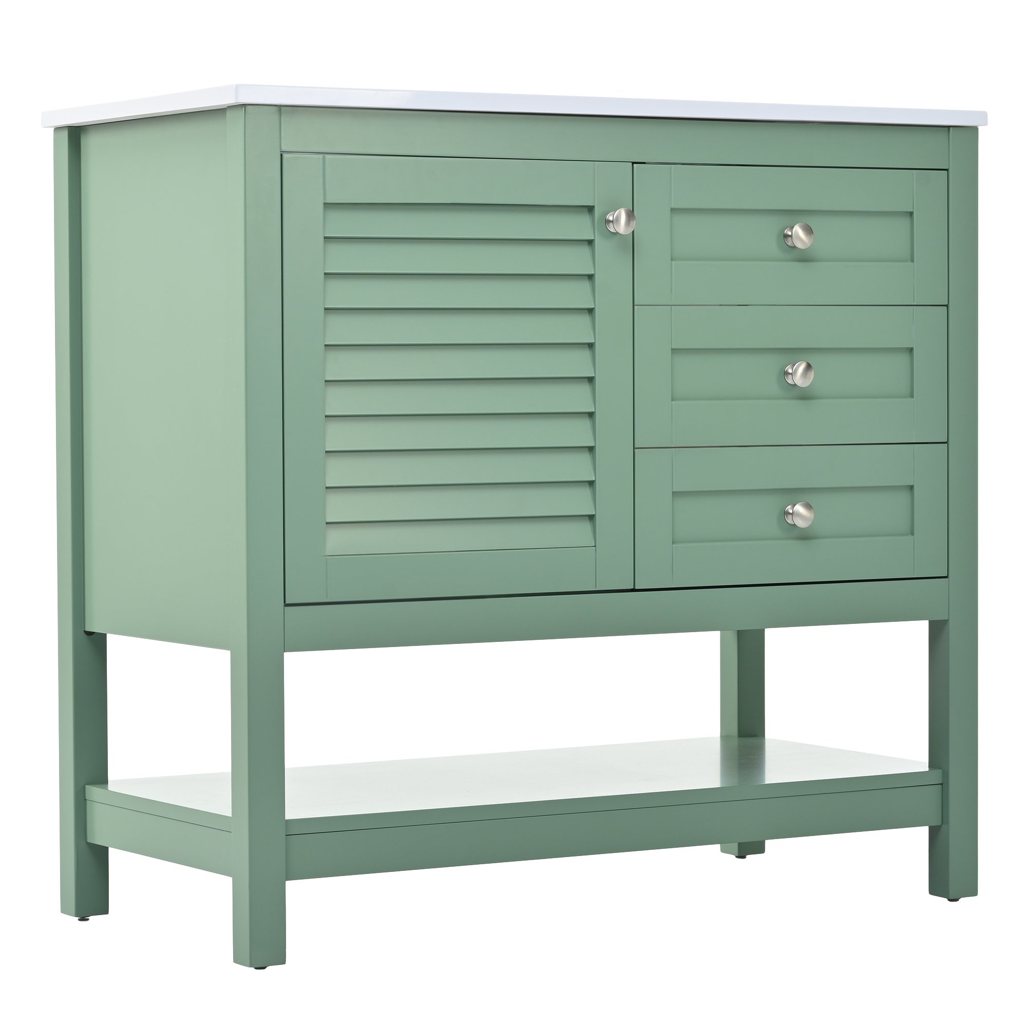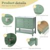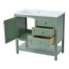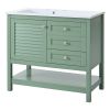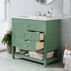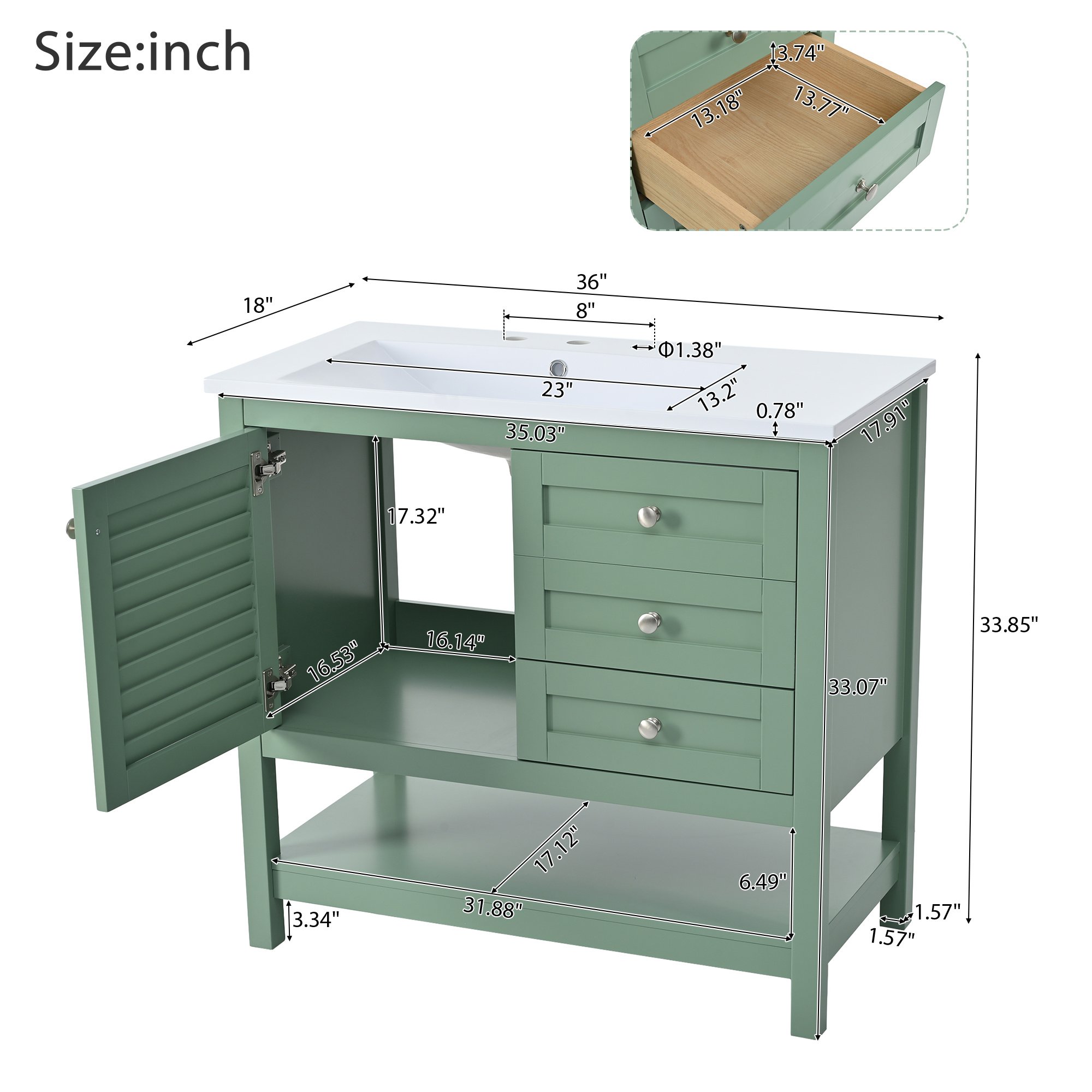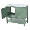 Product NameBathroom VanityMain ColorGreenCapacityOverrall: 220.46lbs/ Panel: 66.14lbs/ Drawer: 11.02lbsMaterialCabinet: MDF+Solid Wood Frame/ Basin: Resin/ Hardware: MetalCountry of OriginMalaysiaDoor IncludedYesNumber of Doors1Drawer IncludedYesNumber of Drawers2Level of AssemblyAll Assembly RequiredAdult Assembly RequiredYesRecommended Number of People for Assembly2NoticeThe color match of the actual product and the product shown in the picture may not be exactly the same. Affecting factors such as lighting, screen settings and resolutions may contribute to the inaccuracy of the color match.