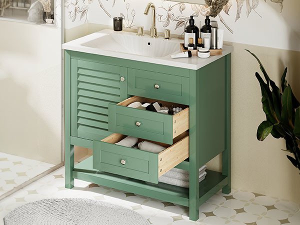 [ Multi-Purpose Cabinet & Concealed Storage ] Are you looking for stylish and functional storage solutions for your bathroom? Our bathroom vanity provide ample space for all your toiletries and bathroom essentials. The combination of the cabinet body and the drawer perfectly stores all kinds of bathroom products and keeps the necessities away from water stains and dust. Soft-close doors and drawer fronts feature a water-resistant paint finish for durability.