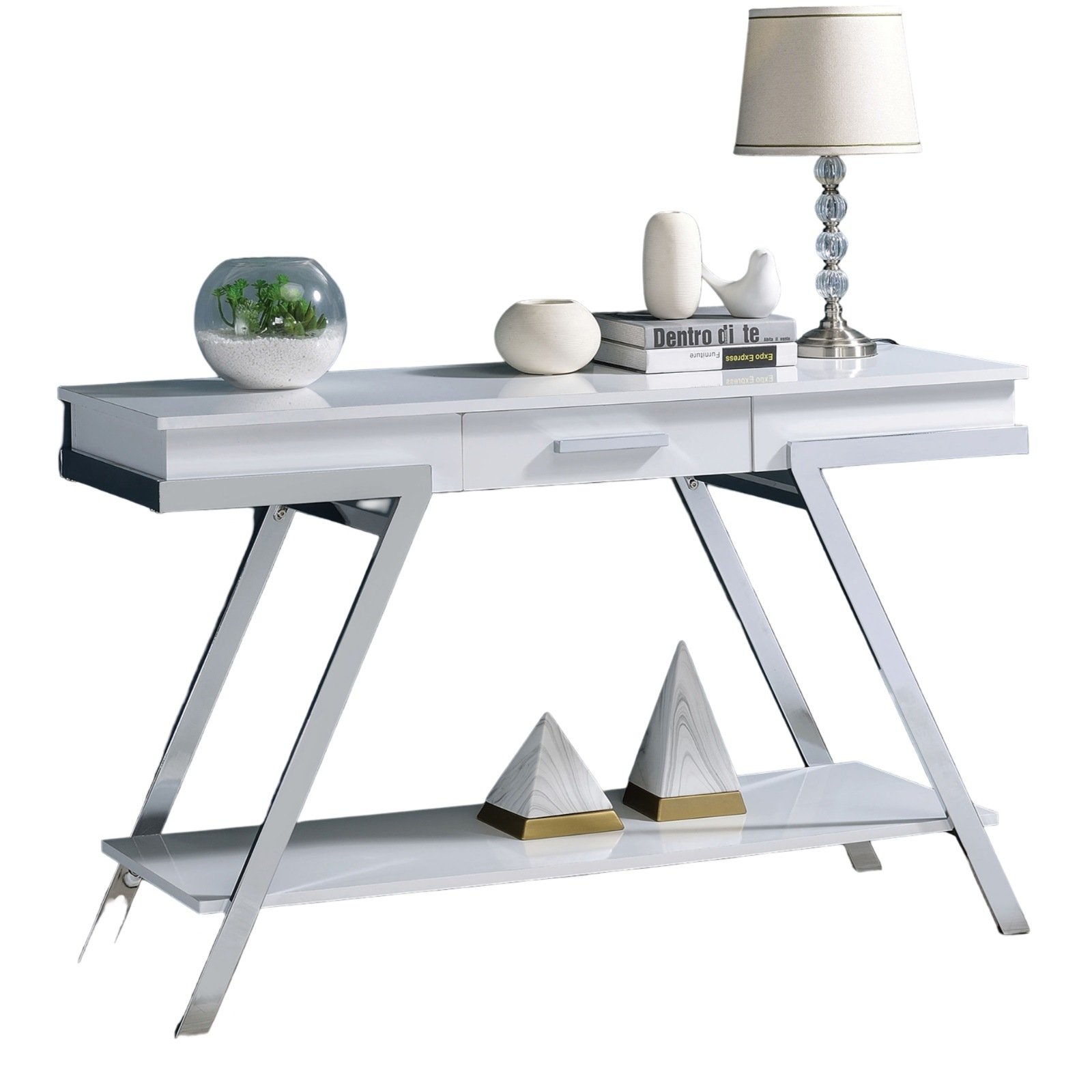 Description:-Each table is available individually, but they all display the same distinct visual geometry. The matching sofa table, (coffee, and end tables-Optional) share an inspired design that incorporates durable steel frames finished in polished chrome, forming the legs of each piece. The table top and the open bottom shelf are both in a high gloss finish, complementing the chrome pretty nicely. Drawers are available, along with a lift top mechanism on the coffee table for extra storage and a more flexible piece.Listing includes - 1pc Sofa Table / Console Table only.End Table And Coffee Table are Not Included.Dimensions-1x Console Table - 47 1/2"L X 15 3/4"W X 29 1/2"HFeatures :-ContemporaryWhite/ChromeSteel, Paper Veneer, OthersChrome FrameBall Bearing GlidesStorage DrawersOpen Bottom ShelfHigh Gloss FinishSimple Assembly Required.
