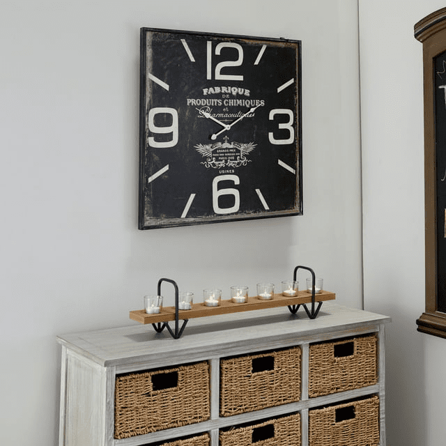 Decmode 23" black wood wall clock is a unique addition to your stylish home. This vintage wall clock will match your classic style interior perfectly when displayed on walls. Requires 1 aa battery. Battery not included. This item ships in 1 carton. This wall clock features number markers, clock hands, and wordings. The clock mechanism runs silent. Square-shaped analog wall clock with a thin black frame. Can be hung vertically using the keyholes on the back; nails and screws not included. Suitable for indoor use only. This item ships fully assembled in one piece. This is a single black colored kitchen clock. Vintage style. 'fabrique de produits chimiques et pharmaceutiques' typography.