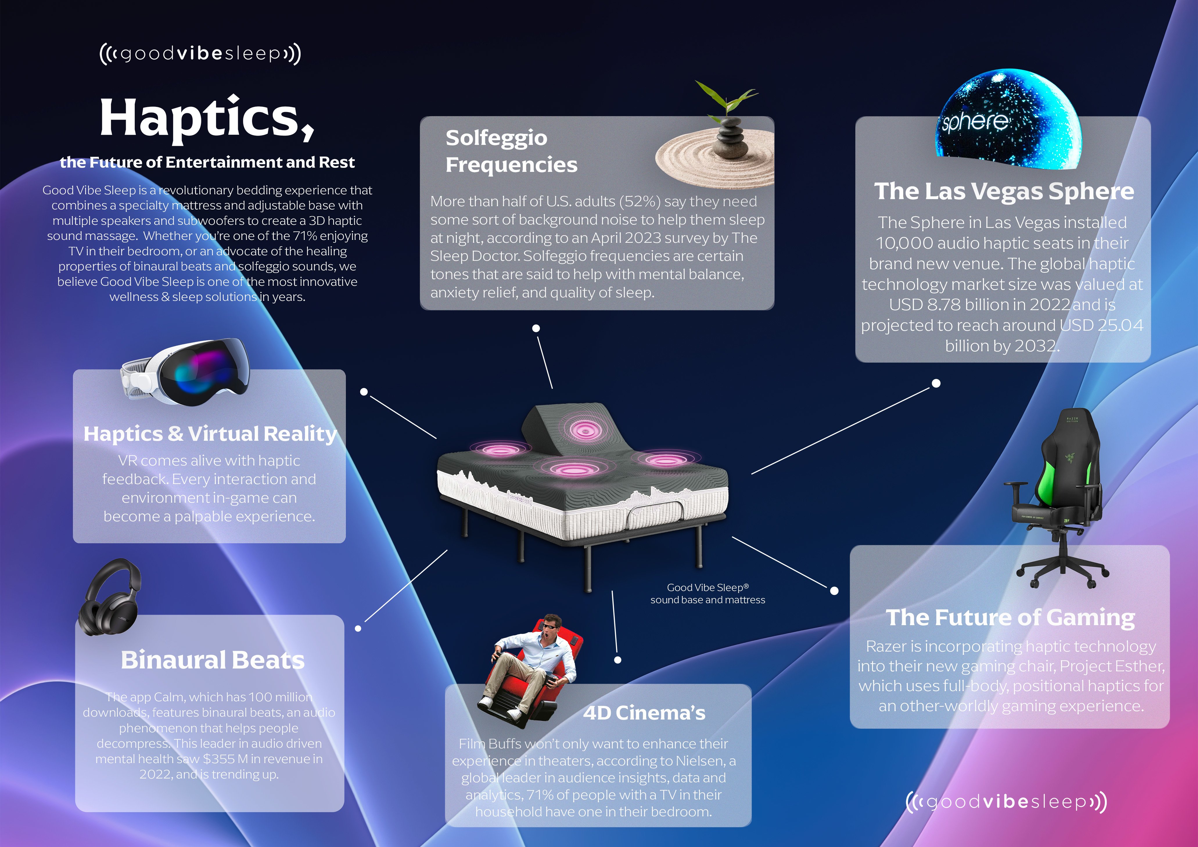 Join the revolution in sleep technology with the GoodVibeSleep Immersive Sound Adjustable Base. This innovative adjustable bed base is the future of entertainment and rest. This state-of-the-art Adjustable Base incorporates Haptics and Solfeggio Frequencies that will provide you with a comprehensive and interactive 3D sensory journey. Haptics is the science of transmitting advanced waveforms that communicate with the media you watch and listen to by conveying tactile sensations that coincide with what you're seeing, hearing or interacting with. Solfeggio Frequencies contain certain tones said to help with mental balance, anxiety relief and quality of sleep. The GoodVibeSleep Immersive Sound Adjustable Base includes built-in bluetooth speakers, subwoofers and surround sound. When paired with a GoodVibeSleep specialty mattress, these increasingly popular technologies will immerse you in a customized, cutting-edge haptic-driven experience so you won't just hear the sound...you'll feel it. Bring big screen blockbusters to your bedroom. Experience elevated gaming entertainment. Feel the power of your playlist. Spoil yourself in Sonic massage. Relax and rejuvenate your body and mind. Settle in for soothing, superior slumber. The most dynamic wellness and sleep solution can be yours when you combine this Immersive Sound Adjustable Base and specialty mattress to create a GoodVibeSleep Comfort Ensemble.