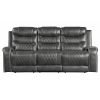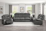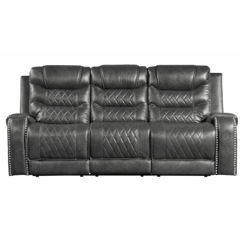 The Putnam Collection will serve as a functional, stylish, and comfortable seating group for your living room. The sofa features dual end manual reclining mechanisms, allowing for perfect placement within your available space. The sofa's drop-down center seatback table features cupholders and power receptacles. The Putnam Collection is offered in gray breathable faux leather upholstery with diamond pattern stitching with nailhead-adorned arms for classic decorative effect.PRODUCT DIMENSIONS: Overall Dimension: 86.5" x 37.5" x 40.5"HSeat Width: 68"Seat Depth: 22.75"Seat Height: 21"Arm height: 23.5"Fully reclined length: 64.5"Fully reclined height: 33"Doorway width: 23.5"Required back clearance to recline: 4.75"Listing Includes: One Sofa (Double Reclining) Only.Loveseat and Chair: Not IncludedSimple Assembly Require.