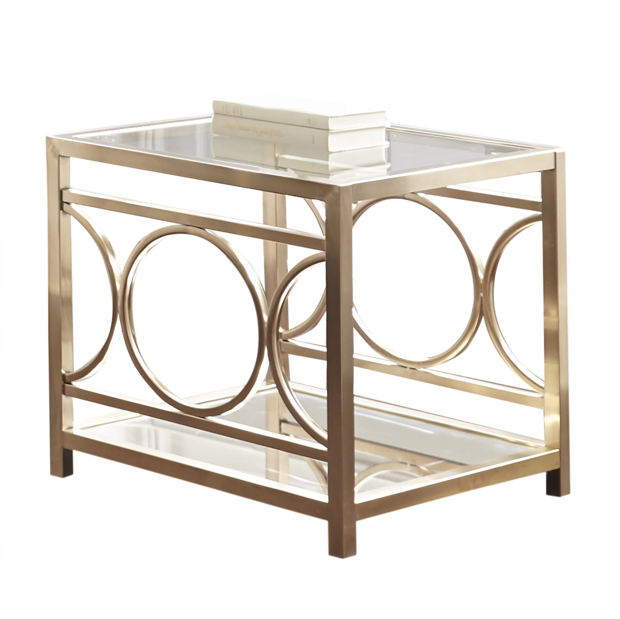 Styling details include contemporary styling in gold chrome finish with concentric circles, glass tops and mirrored bottoms