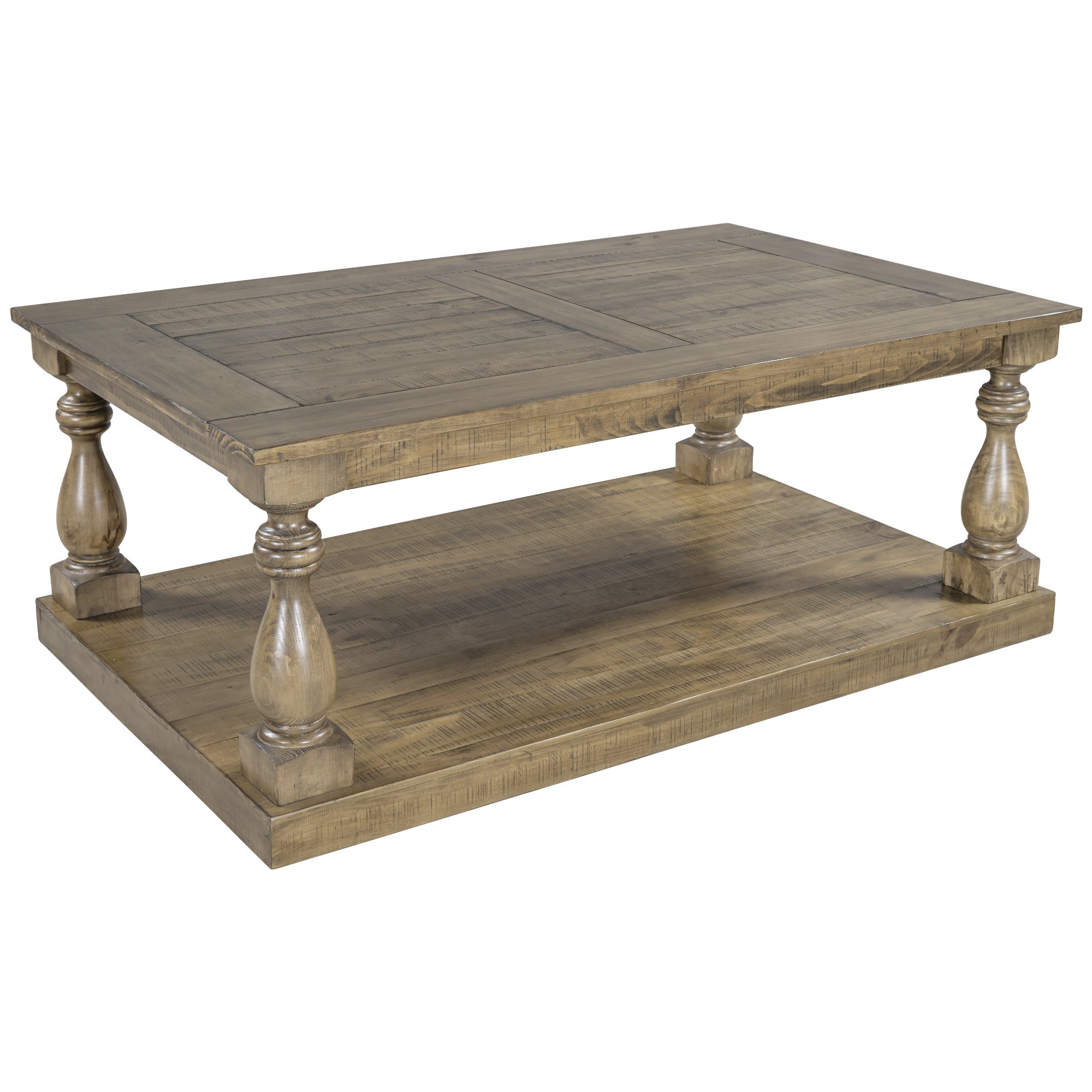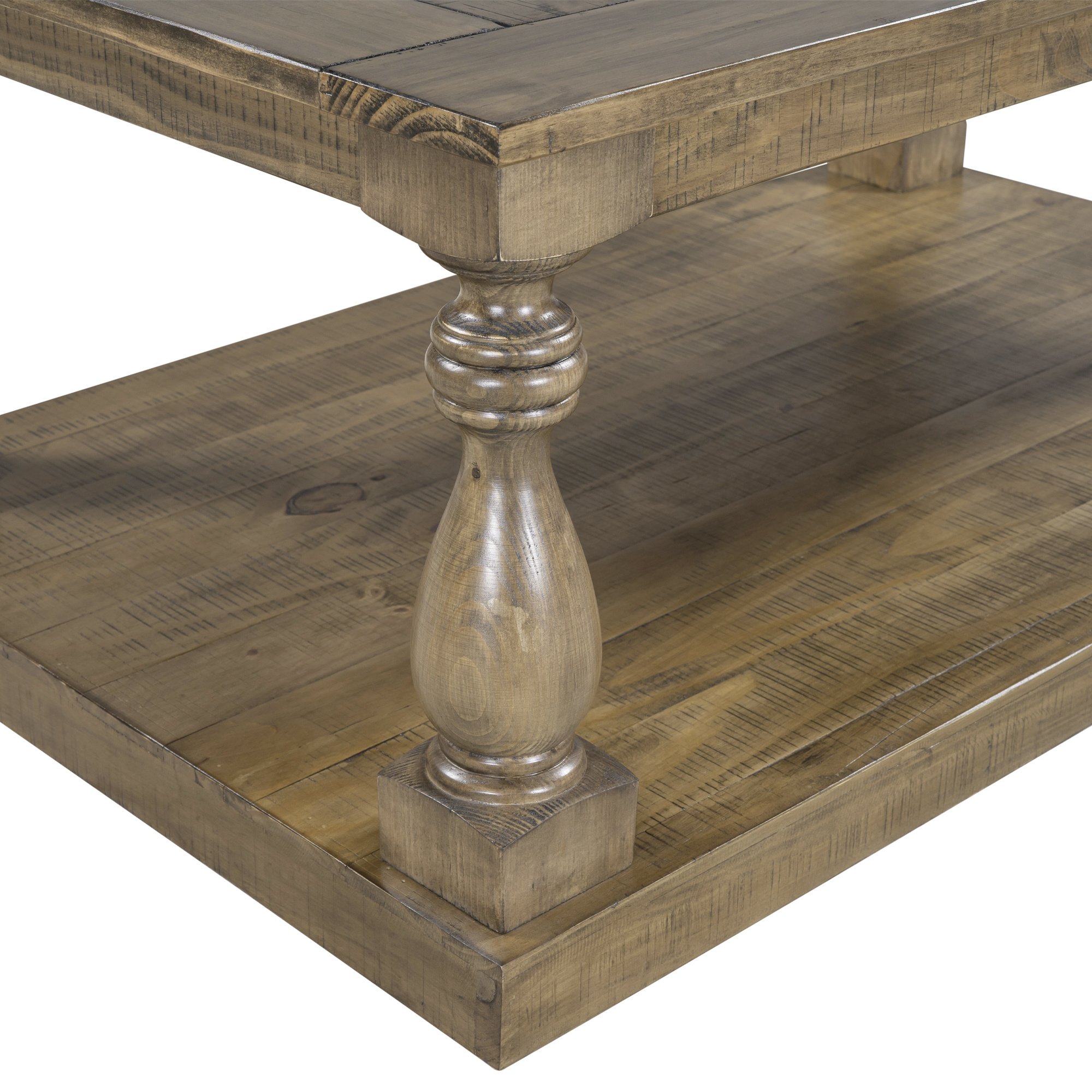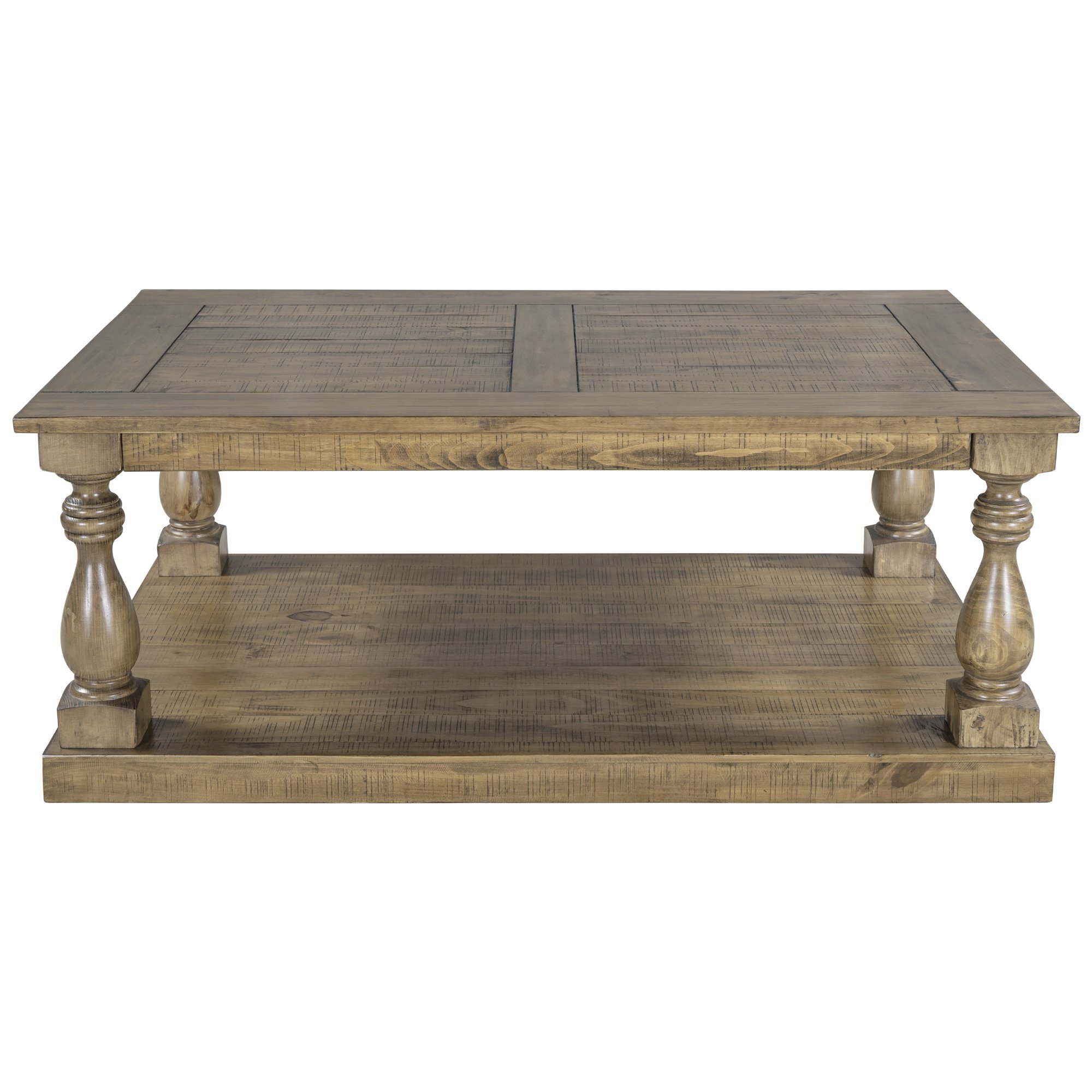 1.This coffee table strikes a chunky, rectangular silhouette with hand-turned baluster column posts, for a classic rustic look.