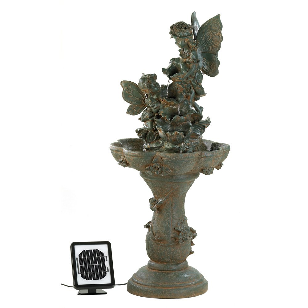 Fabulous fountain features a scene from treasured childhood tales, as a pair of fairies plays in the crystal waterfalls. The magic of solar power lets you add this fountain to your favorite spot without tangled cords, or an optional electrical plug for overcast days. Weight 25 lbs. Polyresin, stonepowder, and sand. Solar panel, pump, electrical adapter included. UL Recognized. Some Assembly Required. 17 1/2" x 17 1/2" x 41 3/8" high. UPC: 849179010393. Due to size and weight, item ships UPS Ground only.