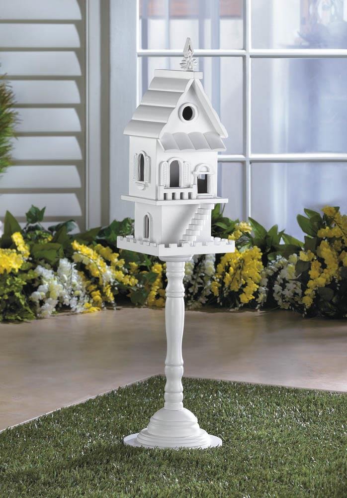 • Give the birds a grand home to call their own with this gorgeous white birdhouse. Its charming features include a front staircase, multiple entrances, two separate floors, a turned pedestal stand, and top decorative finial.