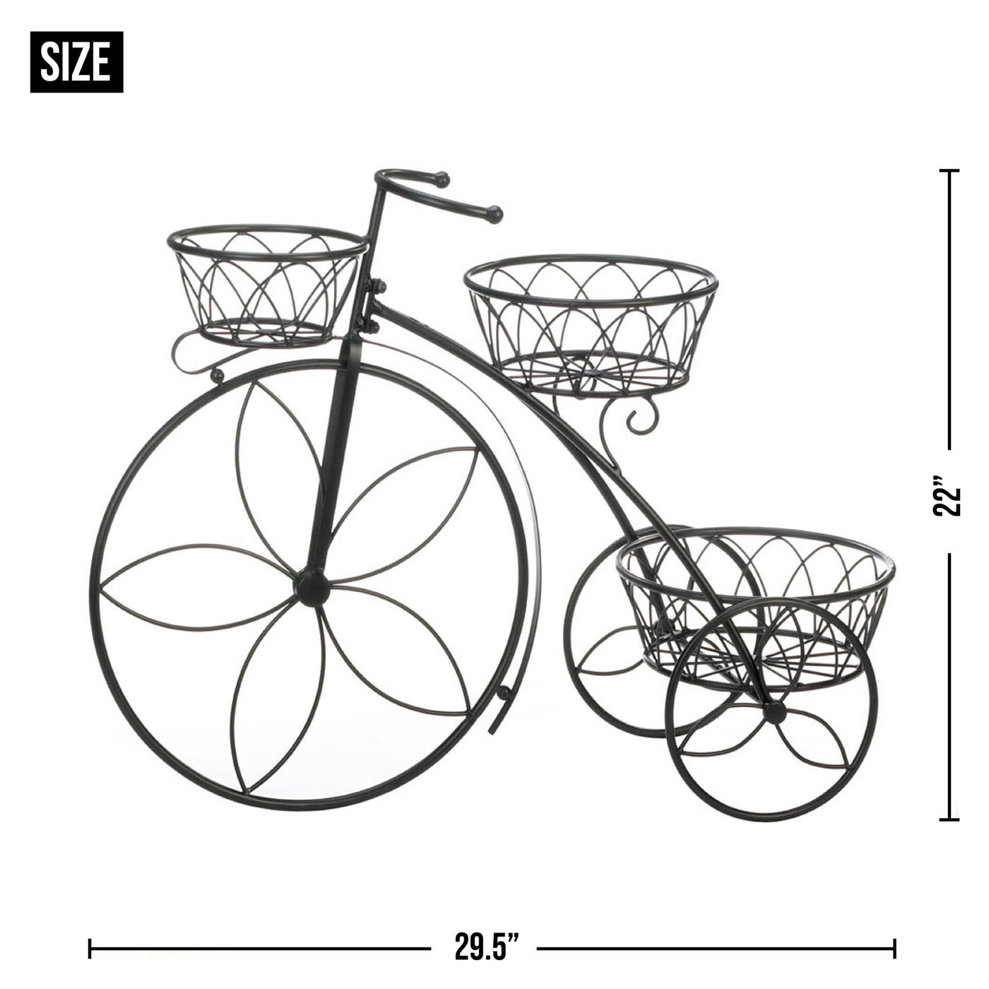 • Holds three plants and can be displayed in your flower garden, on a patio, deck, or sunroom. This charming bicycle plant stand is perfect to show off your favorite potted plants.