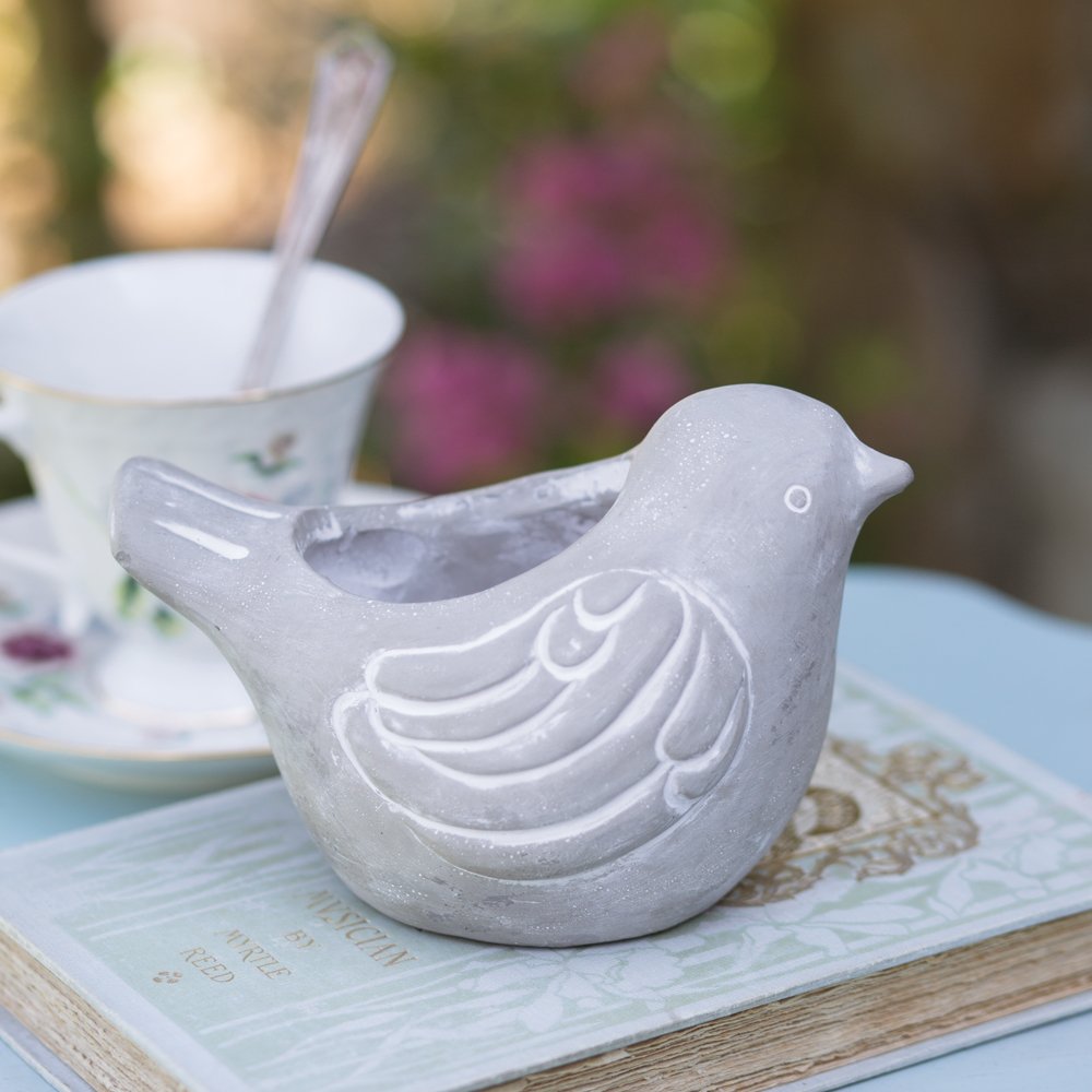 This charming pot features an adorable bird design that adds a playful and whimsical element to your space. It's perfect for showcasing your favorite succulents or small plants. Let this little cement bird perch on your windowsill, shelf, or garden table. The opening hole measures 2¼'' dia.