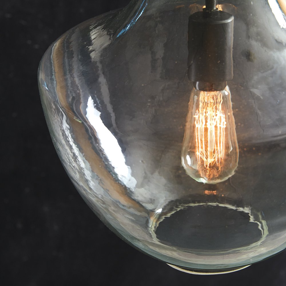 Organic and minimal by nature, this stunning pendant lamp will provide a glistening touch in a room. Item is blown by mouth and variations in glass are to be expected, which help create a beautiful one-of-a-kind piece. Pendant is fashioned from glass and metal with black accents. Includes 39'' of chain and canopy. This pendant lamp is designed to be hardwired: no plug is included. Requires a standard light bulb, not included. 40-watts is the maximum suggested bulb wattage for this item.
