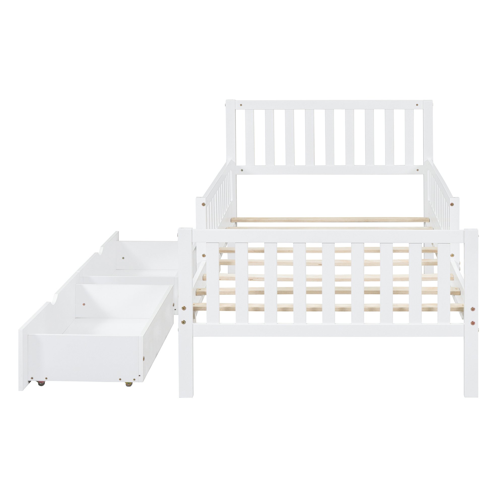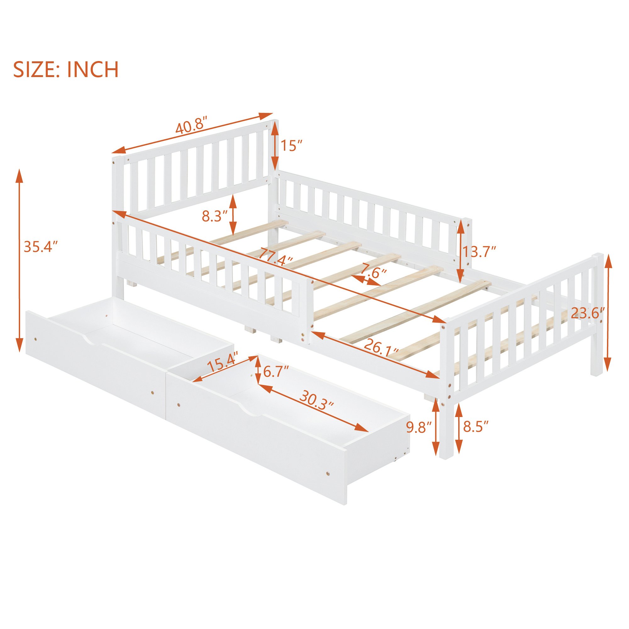 Twin Size Wood Platform Bed with Guardrails on Both Sides and Two Storage Drawers ,WhiteThis Wood Platform Bed with Headboard and Footboard is a minimalistic, stylish bed frame that works well with a variety of decorating styles and makes it easy for you to enhance and improve your space. There are two large drawers under the bed, which can fully save your bedroom space.Featuring strong, solid pine wood and supporting slats, this bed is built to last, ensuring it will accompany you for many years. Do not miss the chance take it home today.
