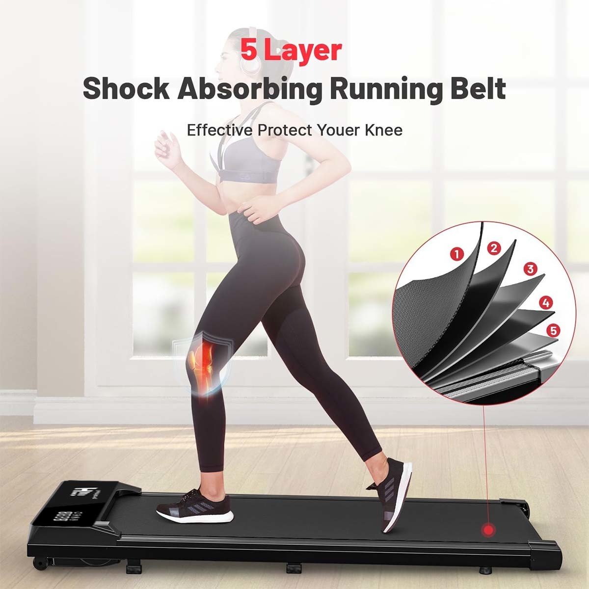 • Shock Absorption & Anti Slip:Portable treadmill adopt sturdy steel frame design, and the bottom of the floor treadmill is installed with 8 shock absorbers that providing effective cushioning for your knees and ankles. 5-layer wear-resistant and anti slip treadmill belt with special texture on the surface to ensure your safety.